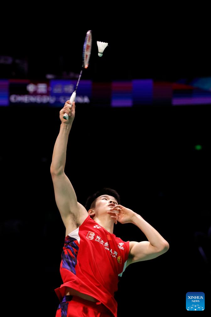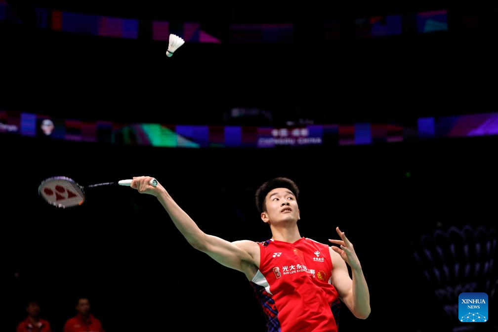 Li Shifeng of China hits a return during the singles match against Jonatan Christie of Indonesia in the final match at the BWF Thomas Cup Finals in Chengdu, southwest China's Sichuan Province, May 5, 2024. (Xinhua/Shen Bohan)