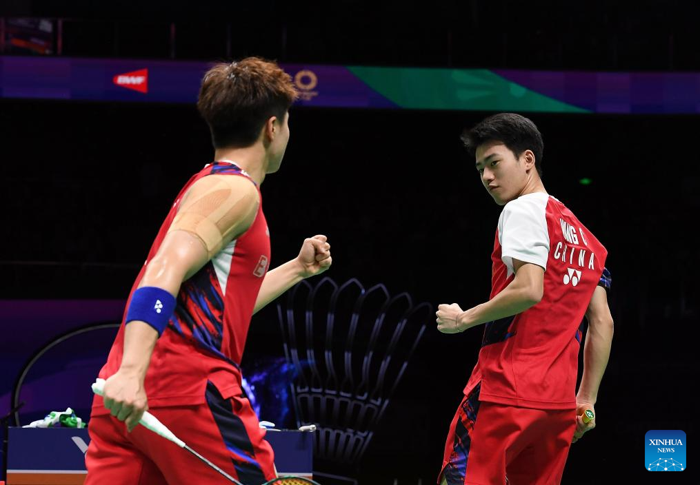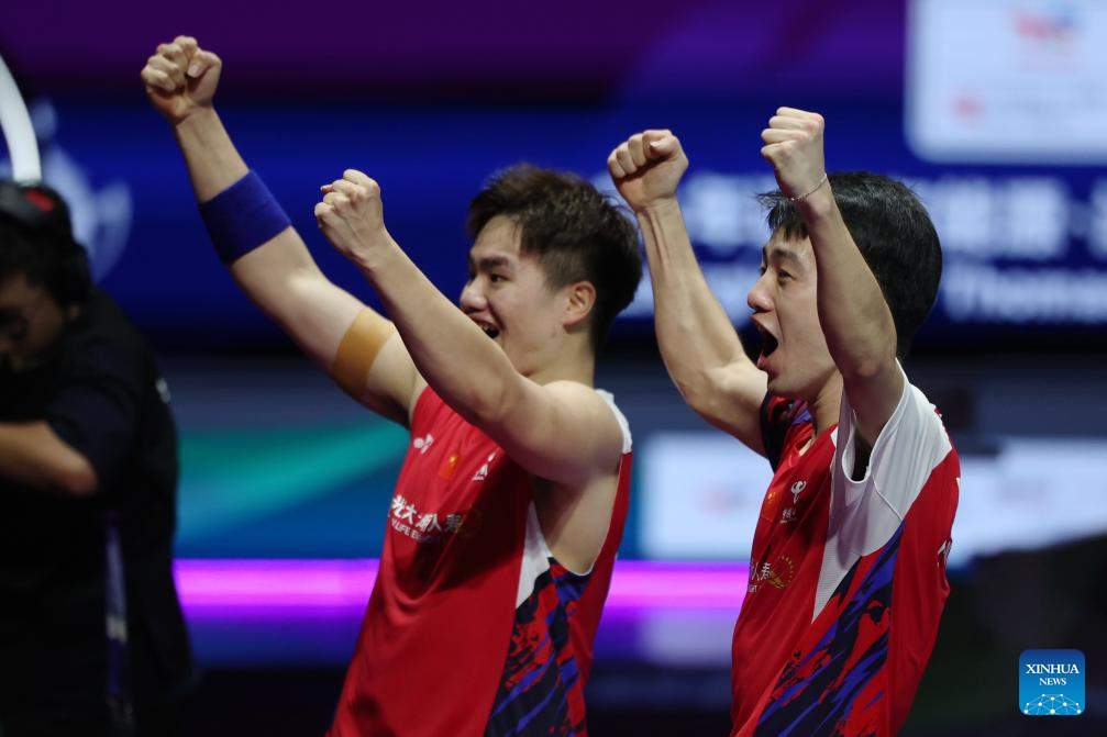 Liang Weikeng (L)/Wang Chang of China celebrate after the doubles match against Muhammad Rian Ardianto/Fajar Alfian of Indonesia in the final match at the BWF Thomas Cup Finals in Chengdu, southwest China's Sichuan Province, May 5, 2024. (Xinhua/Chen Bin)