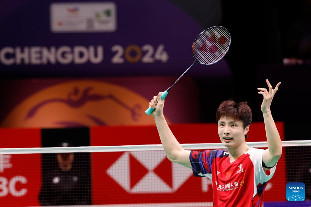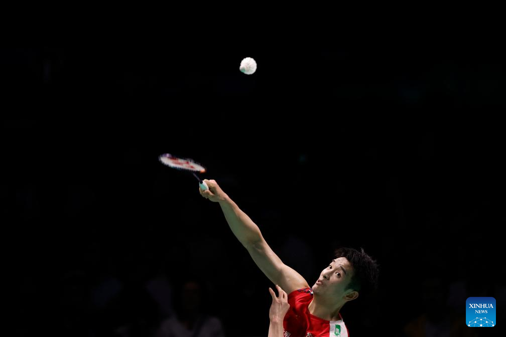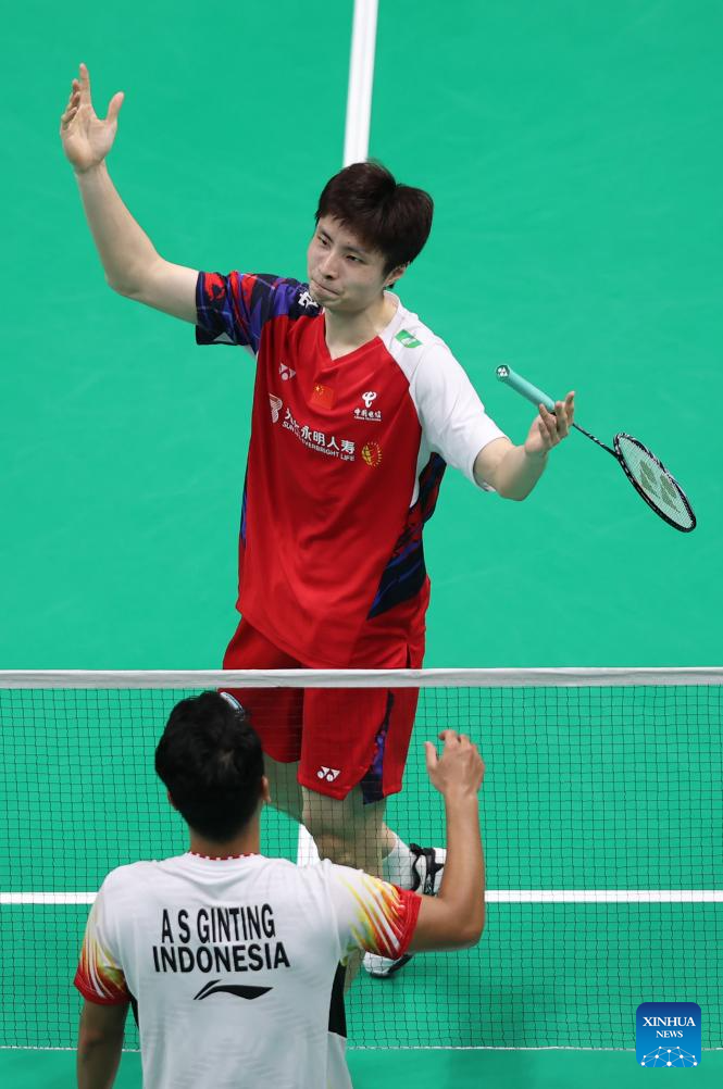 Shi Yuqi of China reacts during the singles match against Anthony Sinisuka Ginting of Indonesia in the final match at the BWF Thomas Cup Finals in Chengdu, southwest China's Sichuan Province, May 5, 2024. (Xinhua/Jia Haocheng)