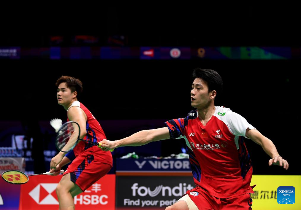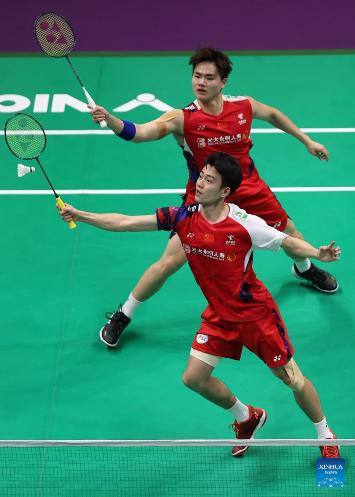 Liang Weikeng/Wang Chang (R) of China compete during the doubles match against Muhammad Rian Ardianto/Fajar Alfian of Indonesia in the final match at the BWF Thomas Cup Finals in Chengdu, southwest China's Sichuan Province, May 5, 2024. (Xinhua/Hou Zhaokang)