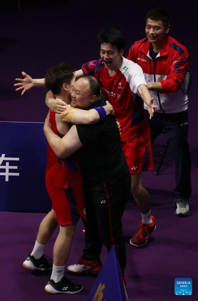 Liang Weikeng (1st L)/Wang Chang (2nd R) of China celebrate with Zhang Jun (2nd L), president of the Chinese Badminton Association, after the doubles match against Muhammad Rian Ardianto/Fajar Alfian of Indonesia in the final match at the BWF Thomas Cup Finals in Chengdu, southwest China's Sichuan Province, May 5, 2024. (Xinhua/Jia Haocheng)