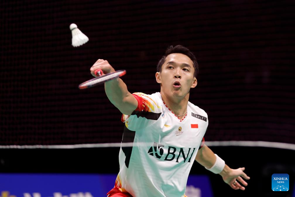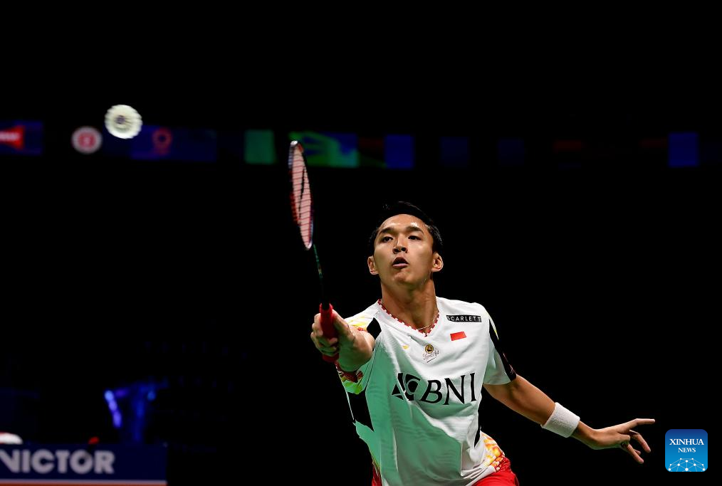 Jonatan Christie of Indonesia hits a return during the singles match against Li Shifeng of China in the final match at the BWF Thomas Cup Finals in Chengdu, southwest China's Sichuan Province, May 5, 2024. (Xinhua/Shen Bohan)