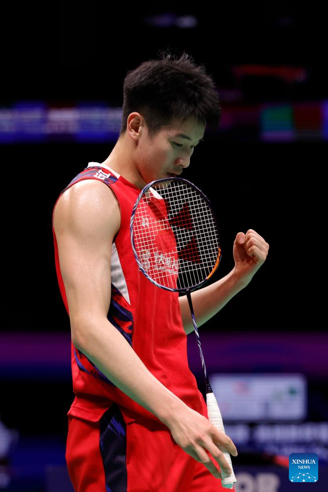 Li Shifeng of China reacts during the singles match against Jonatan Christie of Indonesia in the final match at the BWF Thomas Cup Finals in Chengdu, southwest China's Sichuan Province, May 5, 2024. (Xinhua/Shen Bohan)