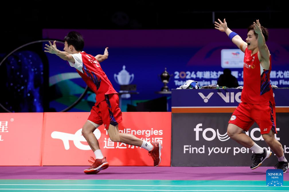 Liang Weikeng (R)/Wang Chang of China celebrate after the doubles match against Muhammad Rian Ardianto/Fajar Alfian of Indonesia in the final match at the BWF Thomas Cup Finals in Chengdu, southwest China's Sichuan Province, May 5, 2024. (Xinhua/Shen Bohan)