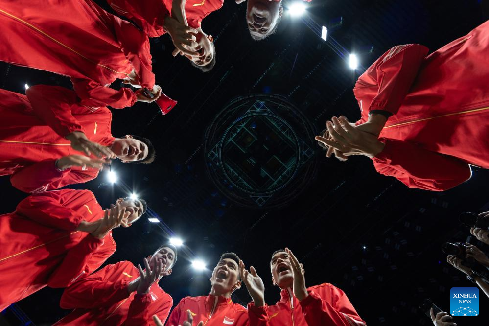Players of Indonesia cheer before the final match between China and Indonesia at the BWF Thomas Cup Finals in Chengdu, southwest China's Sichuan Province, May 5, 2024. (Xinhua/Jiang Hongjing)