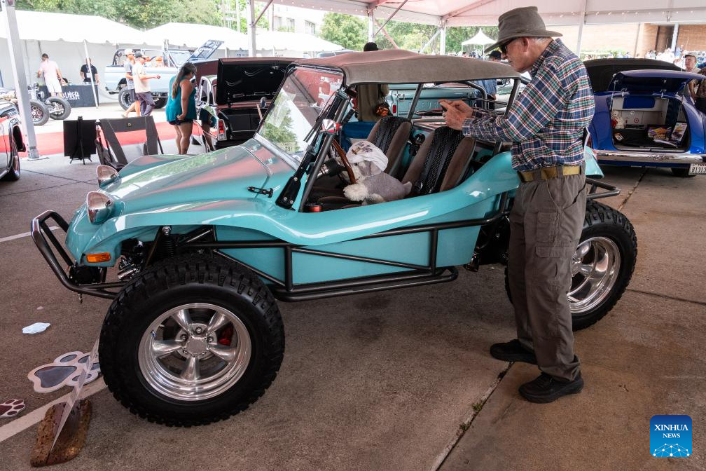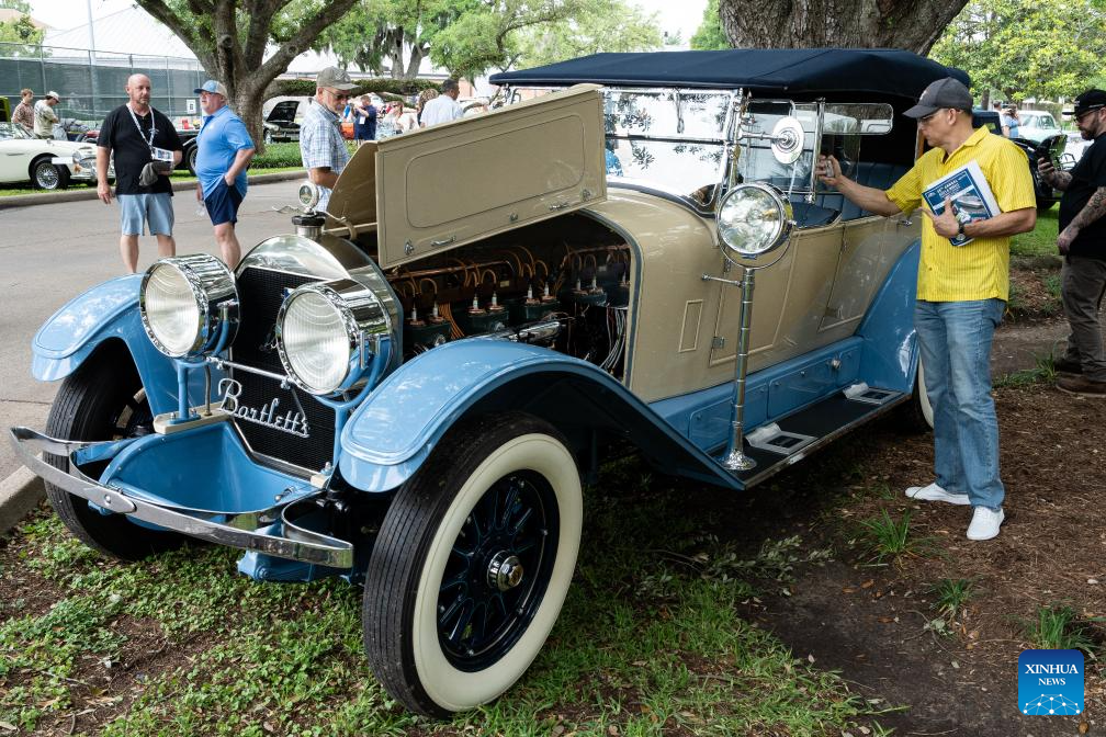 People visit the 28th Keels & Wheels Concours d'Elegance in Seabrook, Texas, the United States, May 4, 2024. The exhibition opened here Saturday, showcasing an impressive collection of over 200 cars and boats. (Photo by Chen Chen/Xinhua)