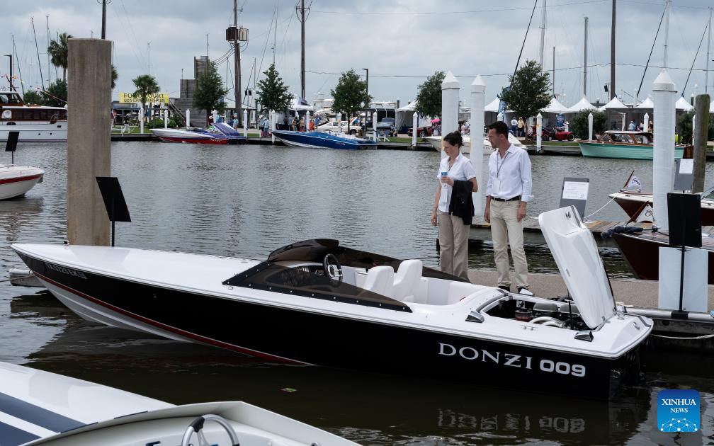 People look at a boat at the 28th Keels & Wheels Concours d'Elegance in Seabrook, Texas, the United States, May 4, 2024. The exhibition opened here Saturday, showcasing an impressive collection of over 200 cars and boats. (Photo by Chen Chen/Xinhua)