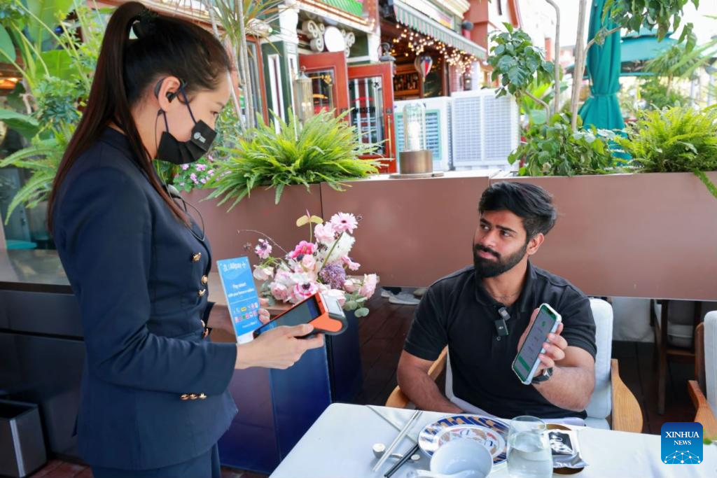 Pakistani tourist Rana uses Pakistan's NayaPay mobile app to pay the bill at a restaurant in the Blue Harbor international shopping park in Chaoyang District of Beijing, capital of China, April 8, 2024.(Xinhua)