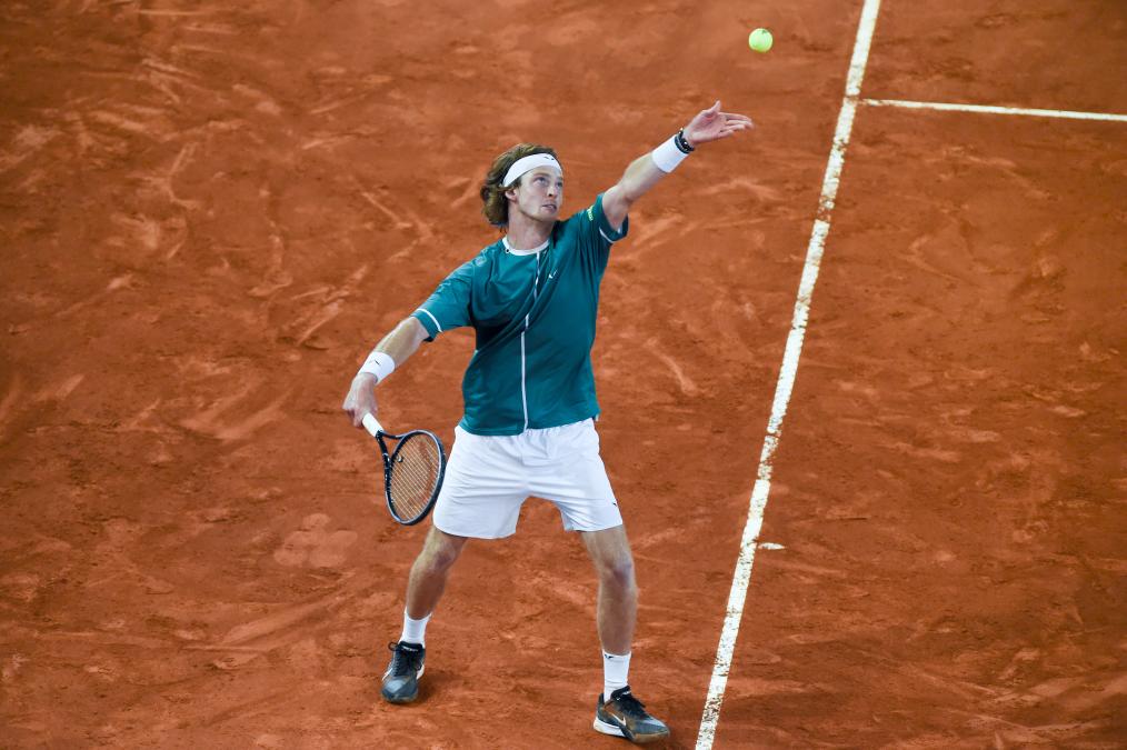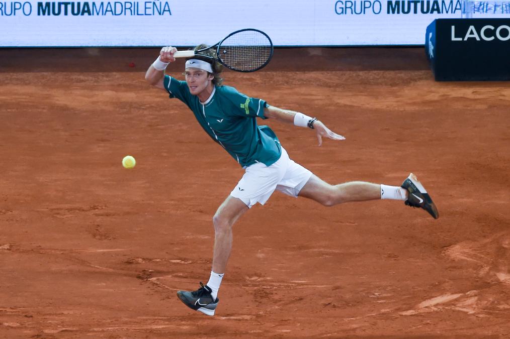 Andrey Rublev of Russia hits a return during the men's singles final against Felix Auger-Aliassime of Canada at the Madrid Open tennis tournament in Madrid, Spain, May 5, 2024. (Photo by Gustavo Valiente/Xinhua)