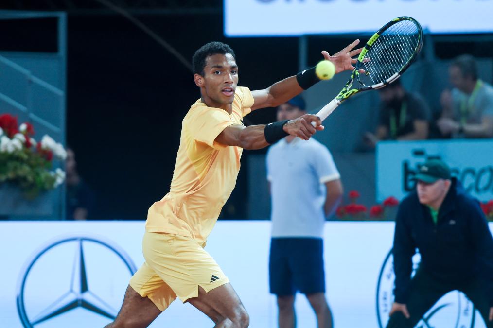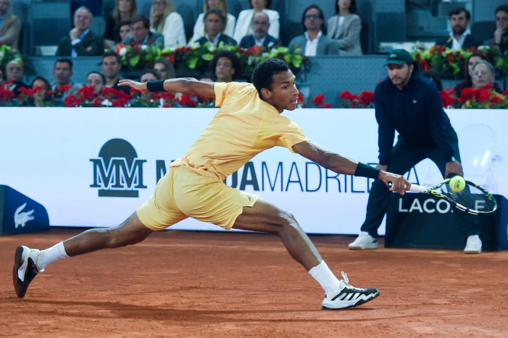 Felix Auger-Aliassime of Canada hits a return during the men's singles final against Andrey Rublev of Russia at the Madrid Open tennis tournament in Madrid, Spain, May 5, 2024. (Photo by Gustavo Valiente/Xinhua)
