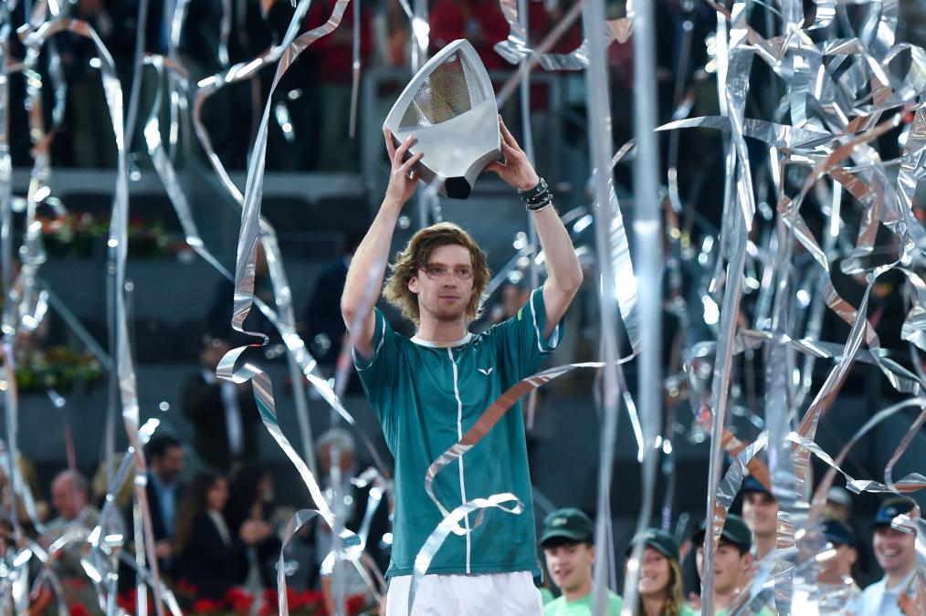 Winner Andrey Rublev of Russia celebrates during the awarding ceremony for the Men's Singles event at the Madrid Open tennis tournament in Madrid, Spain, May 5, 2024. (Photo by Gustavo Valiente/Xinhua)