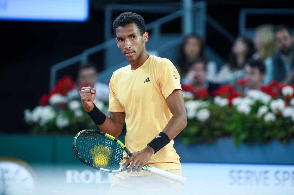 Felix Auger-Aliassime of Canada reacts during the men's singles final against Andrey Rublev of Russia at the Madrid Open tennis tournament in Madrid, Spain, May 5, 2024. (Photo by Gustavo Valiente/Xinhua)