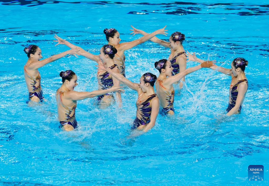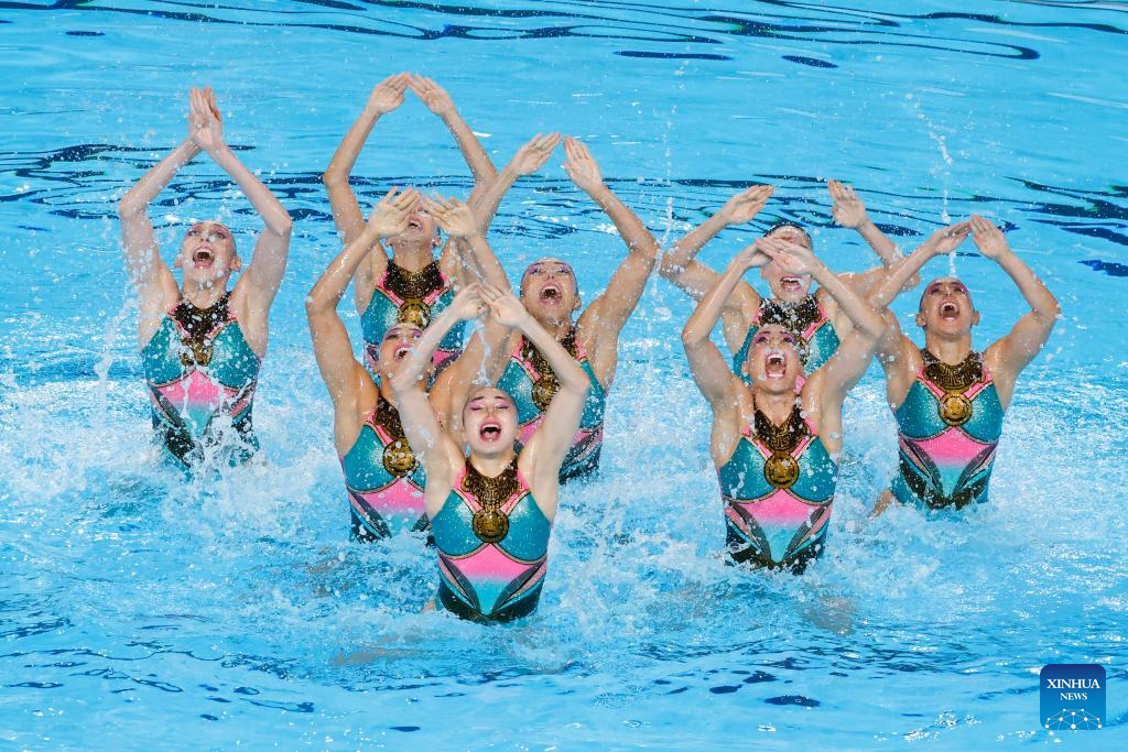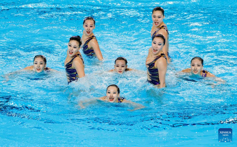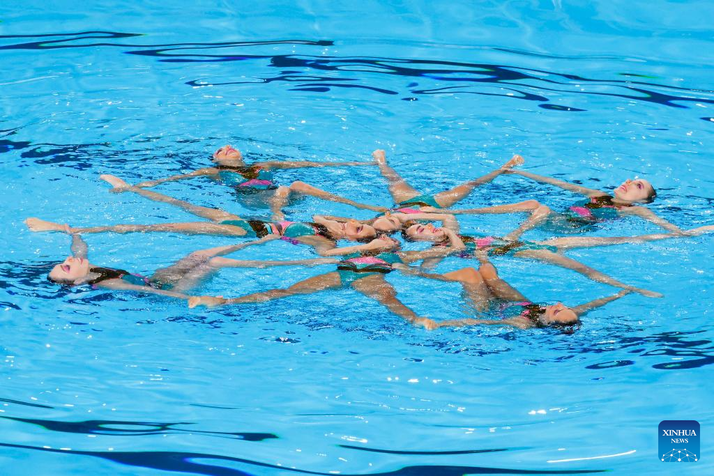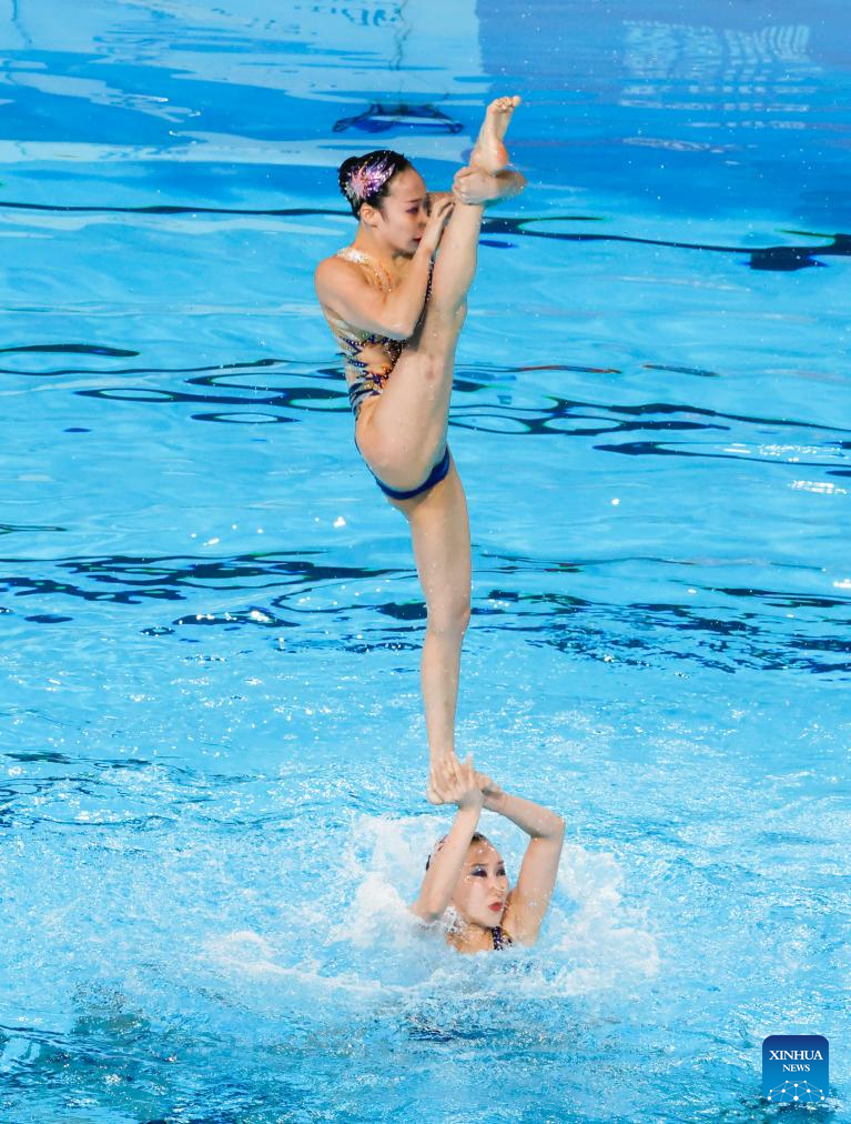 Team China compete during the team acrobatic event at the World Aquatics Artistic Swimming World Cup 2024 in St-Denis, France, May 5, 2024. (Photo by Henri Szwarc/Xinhua)