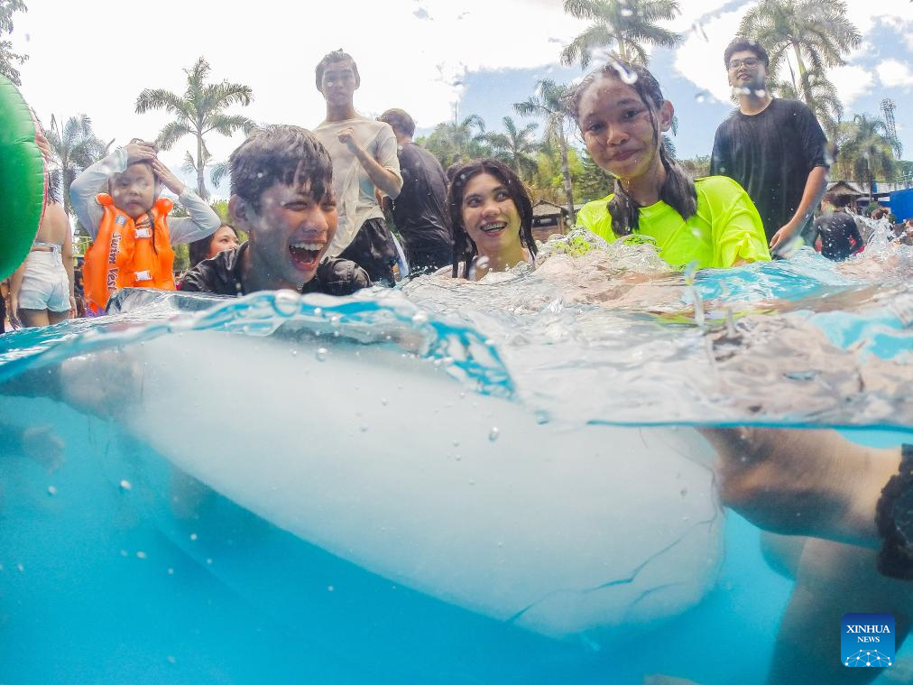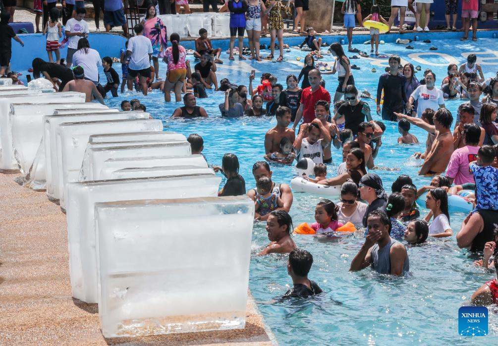 People cool off with ice blocks in a swimming pool at a resort in Bulacan Province, the Philippines, on May 5, 2024. People spend time at pools to cool off amid heatwave in the Philippines. (Xinhua/Rouelle Umali)