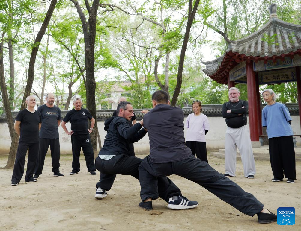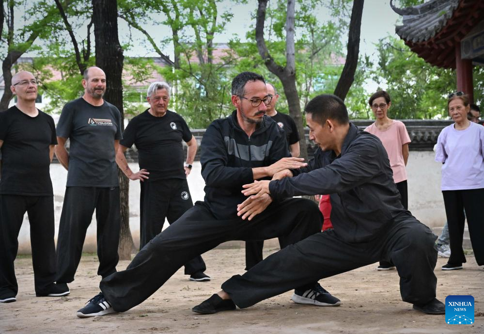 Chen Ziqiang (front R) instructs Guillaume Large (front L) in Chenjiagou Village of Wenxian County, central China's Henan Province, April 18, 2024. Guillaume Large (Chen Shaoquan), a 44-year-old Taichi enthusiast from Bordeaux of France, has been practicing Taichi for over 20 years. Guillaume Large got a sports injury in his young age and decided to start practicing Taichi at a local club in France as a way of recovery. From then on he gradually fell in love with Taichi. In 2007, Guillaume Large and his fellows established an association, aiming to promote Chinese culture in France through teaching Taichi and Chinese, etc.(Xinhua/Li An)