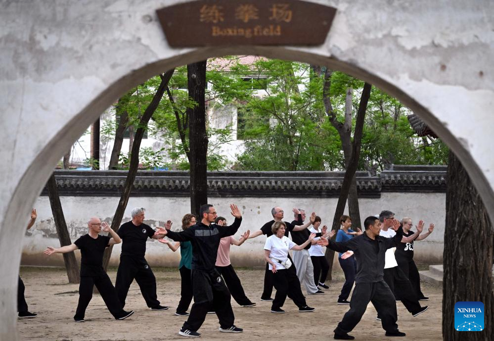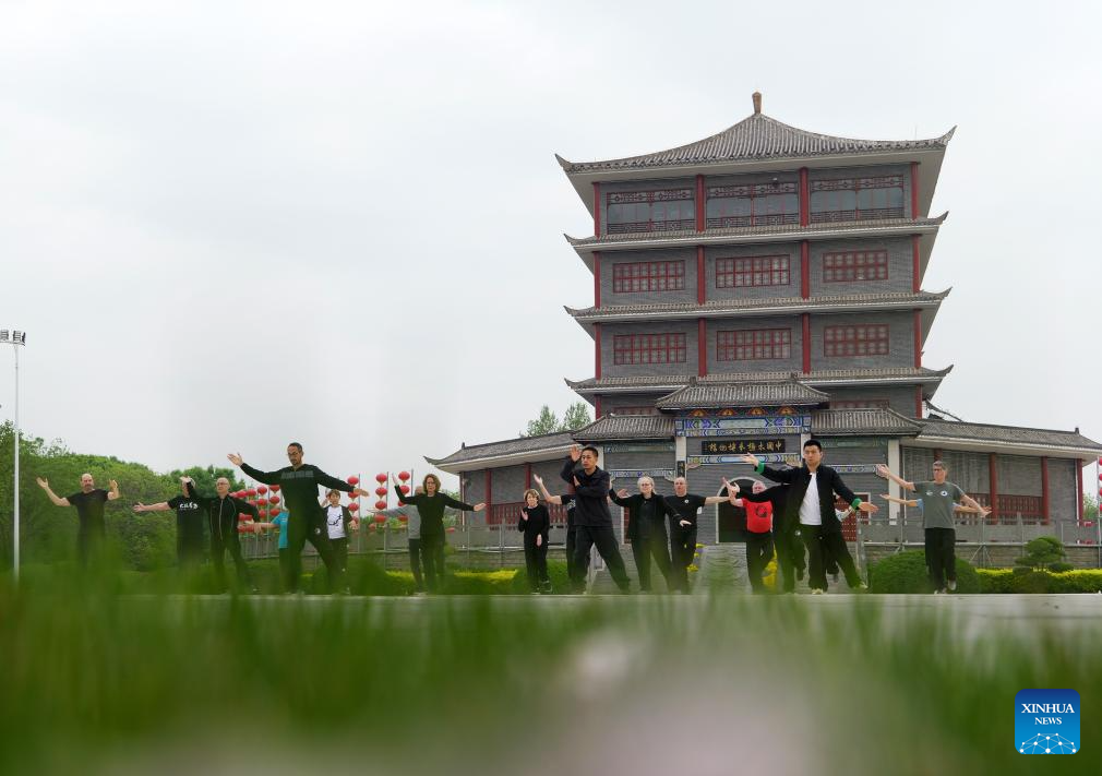 Chen Ziqiang (front) practices Taichi with French students in Chenjiagou Village of Wenxian County, central China's Henan Province, April 19, 2024. Guillaume Large (Chen Shaoquan), a 44-year-old Taichi enthusiast from Bordeaux of France, has been practicing Taichi for over 20 years. Guillaume Large got a sports injury in his young age and decided to start practicing Taichi at a local club in France as a way of recovery. From then on he gradually fell in love with Taichi. In 2007, Guillaume Large and his fellows established an association, aiming to promote Chinese culture in France through teaching Taichi and Chinese, etc.(Xinhua/Li An)