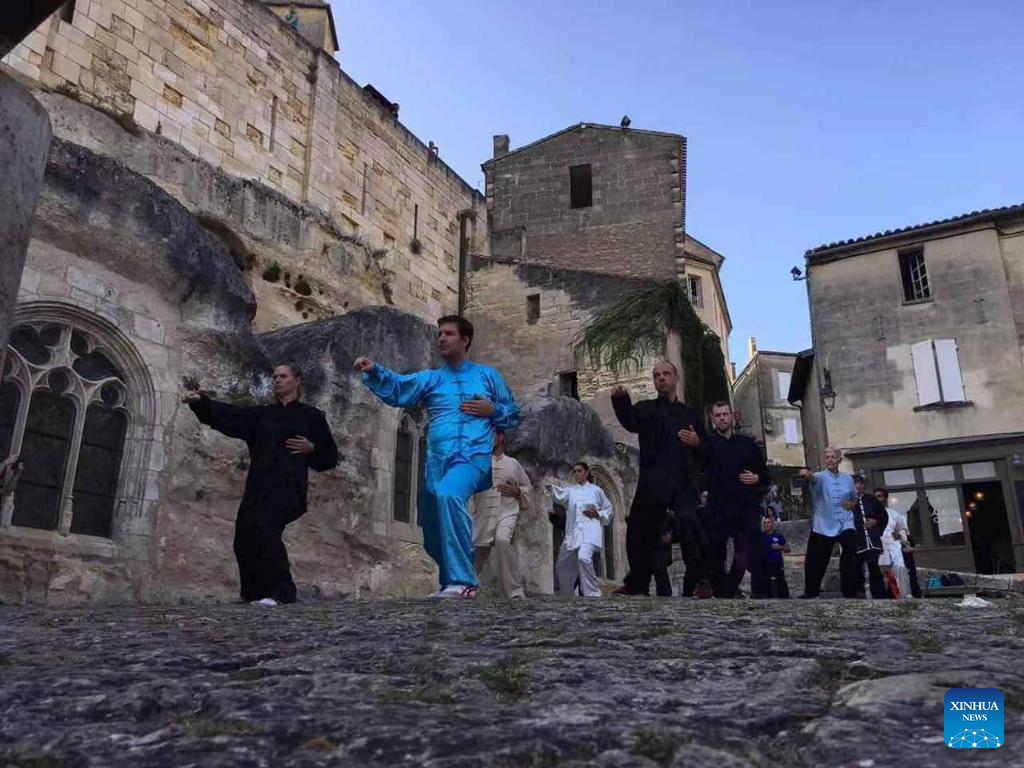 French students practice Taichi on the St. Emilion Monolithic Church Square near Bordeaux, France, 2019. Guillaume Large (Chen Shaoquan), a 44-year-old Taichi enthusiast from Bordeaux of France, has been practicing Taichi for over 20 years. Guillaume Large got a sports injury in his young age and decided to start practicing Taichi at a local club in France as a way of recovery. From then on he gradually fell in love with Taichi. In 2007, Guillaume Large and his fellows established an association, aiming to promote Chinese culture in France through teaching Taichi and Chinese, etc.(Xinhua)