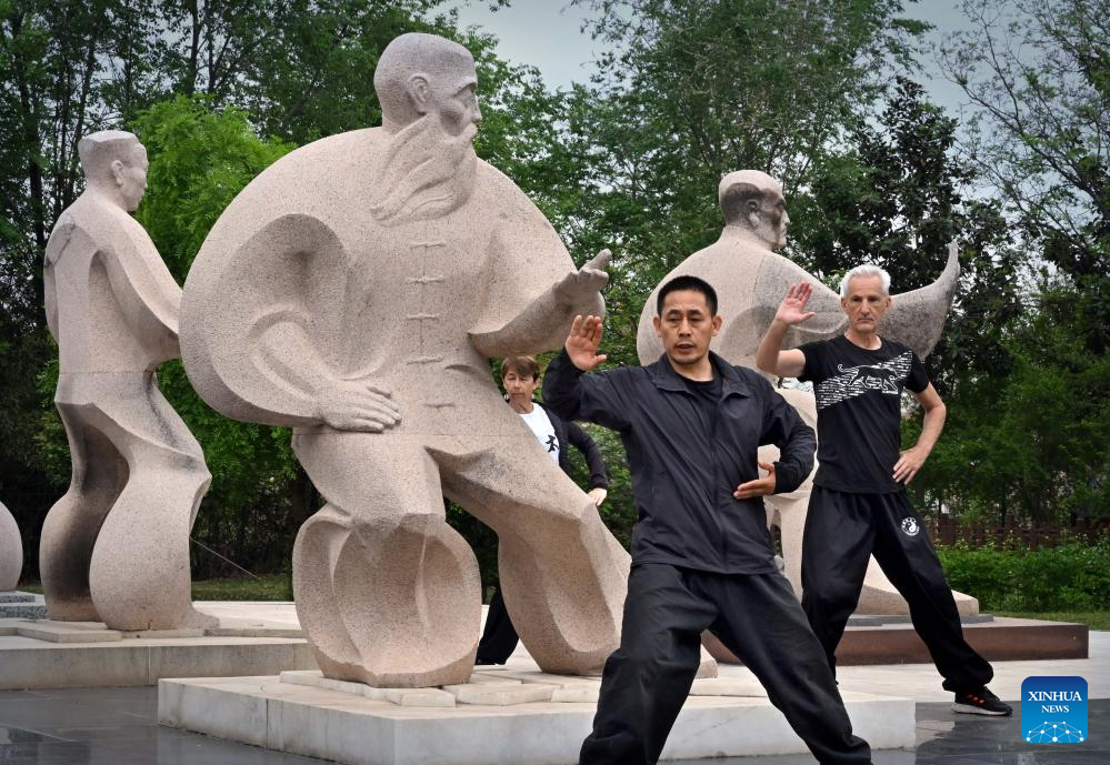 Guillaume Large (front L) and Chen Ziqiang (front R) practice Taichi in Chenjiagou Village of Wenxian County, central China's Henan Province, April 18, 2024. Guillaume Large (Chen Shaoquan), a 44-year-old Taichi enthusiast from Bordeaux of France, has been practicing Taichi for over 20 years. Guillaume Large got a sports injury in his young age and decided to start practicing Taichi at a local club in France as a way of recovery. From then on he gradually fell in love with Taichi. In 2007, Guillaume Large and his fellows established an association, aiming to promote Chinese culture in France through teaching Taichi and Chinese, etc.(Xinhua/Li An)