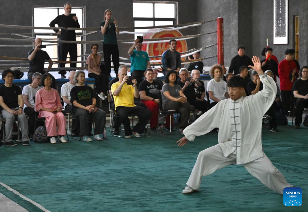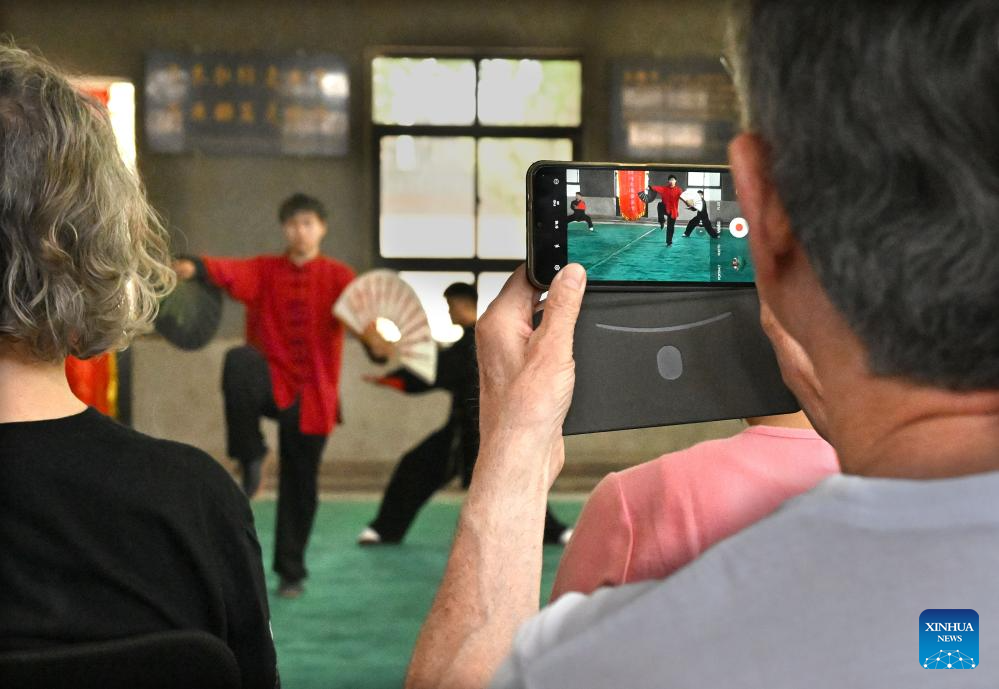 A French student takes a video of the Taichi performance in Chenjiagou Village of Wenxian County, central China's Henan Province, April 18, 2024. Guillaume Large (Chen Shaoquan), a 44-year-old Taichi enthusiast from Bordeaux of France, has been practicing Taichi for over 20 years. Guillaume Large got a sports injury in his young age and decided to start practicing Taichi at a local club in France as a way of recovery. From then on he gradually fell in love with Taichi. In 2007, Guillaume Large and his fellows established an association, aiming to promote Chinese culture in France through teaching Taichi and Chinese, etc.(Xinhua/Li An)