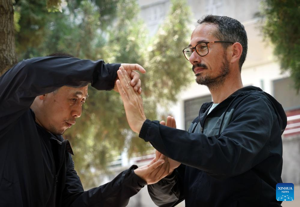 Chen Ziqiang (L) instructs Guillaume Large in Chenjiagou Village of Wenxian County, central China's Henan Province, April 18, 2024. Guillaume Large (Chen Shaoquan), a 44-year-old Taichi enthusiast from Bordeaux of France, has been practicing Taichi for over 20 years. Guillaume Large got a sports injury in his young age and decided to start practicing Taichi at a local club in France as a way of recovery. From then on he gradually fell in love with Taichi. In 2007, Guillaume Large and his fellows established an association, aiming to promote Chinese culture in France through teaching Taichi and Chinese, etc.(Xinhua/Li Jianan)