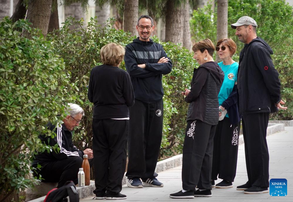 Guillaume Large (3rd L) communicates with French students in Chenjiagou Village of Wenxian County, central China's Henan Province, April 19, 2024. Guillaume Large (Chen Shaoquan), a 44-year-old Taichi enthusiast from Bordeaux of France, has been practicing Taichi for over 20 years. Guillaume Large got a sports injury in his young age and decided to start practicing Taichi at a local club in France as a way of recovery. From then on he gradually fell in love with Taichi. In 2007, Guillaume Large and his fellows established an association, aiming to promote Chinese culture in France through teaching Taichi and Chinese, etc.(Xinhua/Li An)