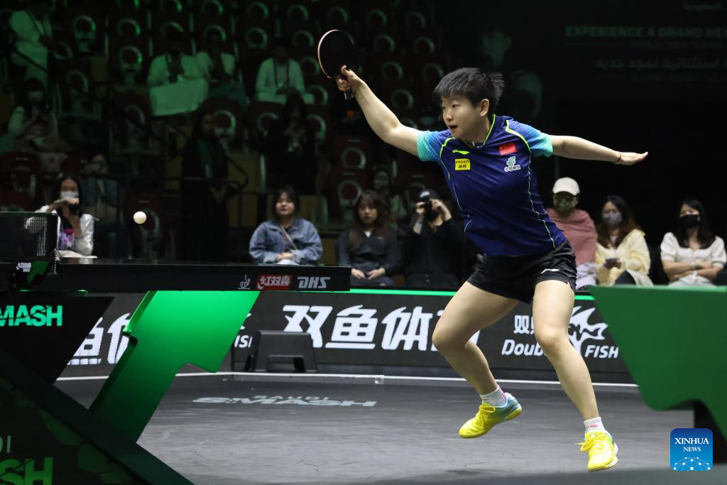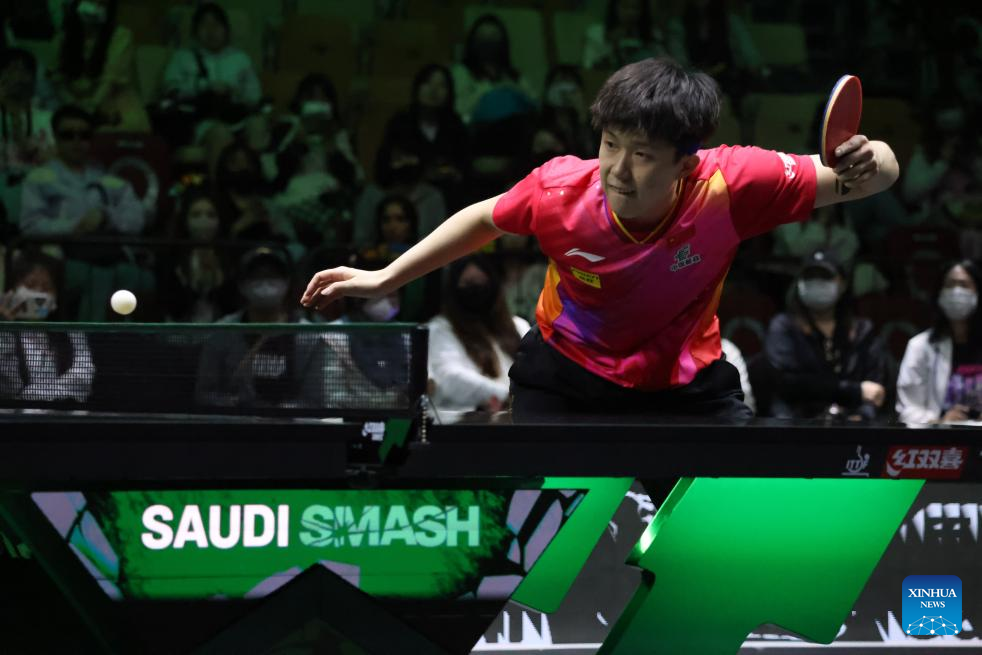 Sun Yingsha of China hits a return during the women's singles round of 16 match against Jeon Jihee of South Korea at WTT Saudi Smash 2024 in Jeddah, Saudi Arabia, May 8, 2024. (Xinhua/Wang Haizhou)