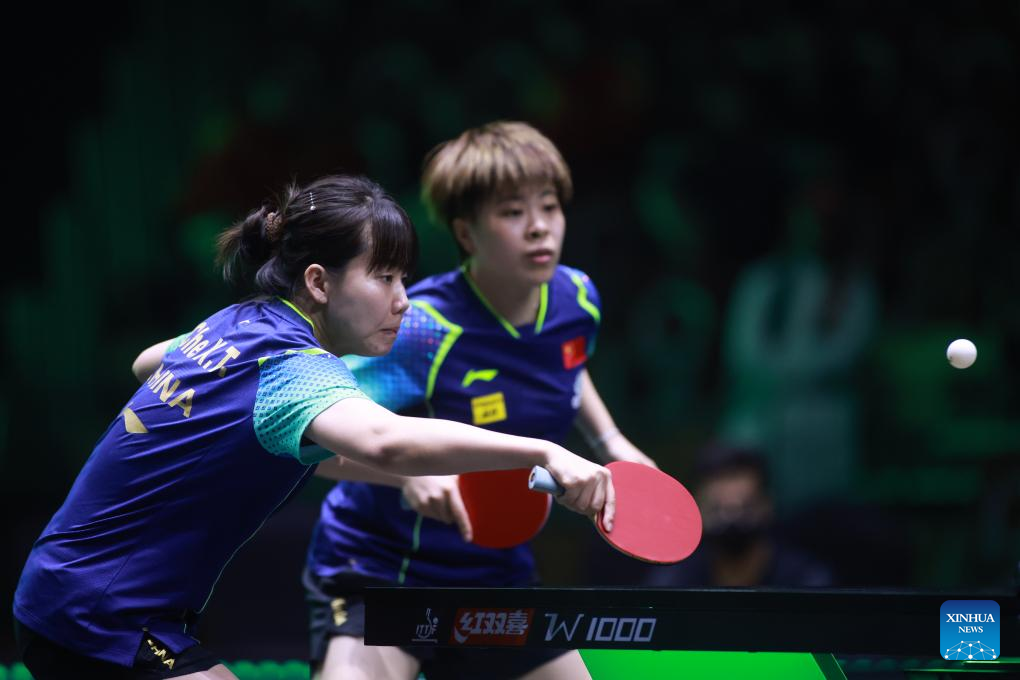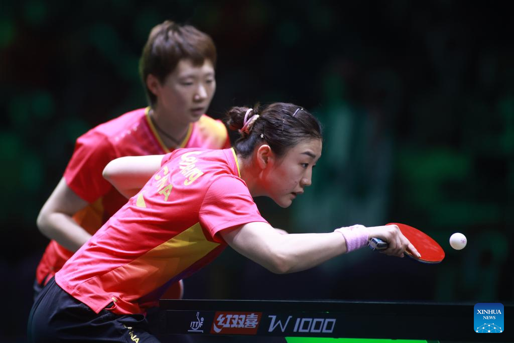 Chen Meng (front)/Wang Manyu of China compete during the women's doubles quarterfinal match against their compatriots Wang Yidi/Chen Xingtong at WTT Saudi Smash 2024 in Jeddah, Saudi Arabia, May 8, 2024. (WTT/Handout via Xinhua)