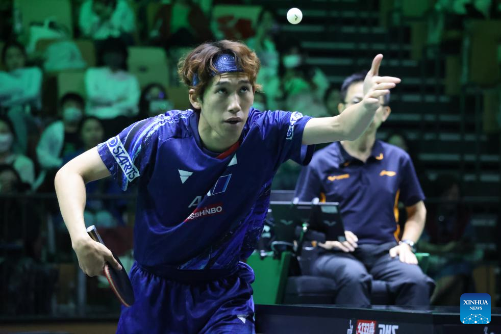 Yoshimura Maharu of Japan serves during the men's singles round of 16 match against Wang Chuqin of China at WTT Saudi Smash 2024 in Jeddah, Saudi Arabia, May 8, 2024. (Xinhua/Wang Haizhou)