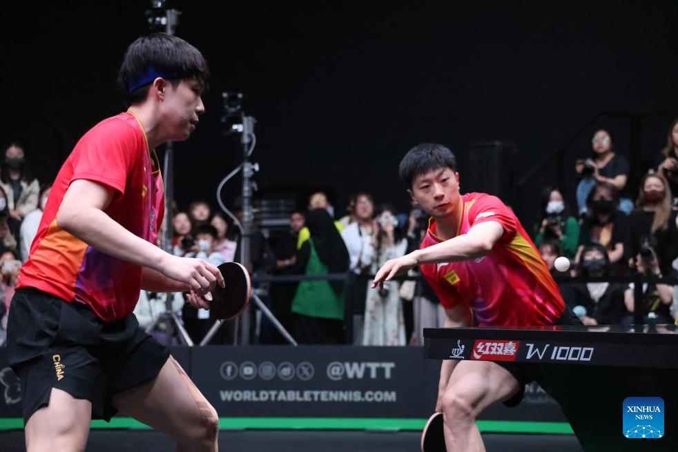 Ma Long (front)/Wang Chuqin of China compete during the men's doubles quarterfinal match against Dyjas Jakub (Poland)/Cedric Nuytinck (Belgium) at WTT Saudi Smash 2024 in Jeddah, Saudi Arabia, May 8, 2024. (Xinhua/Wang Haizhou)
