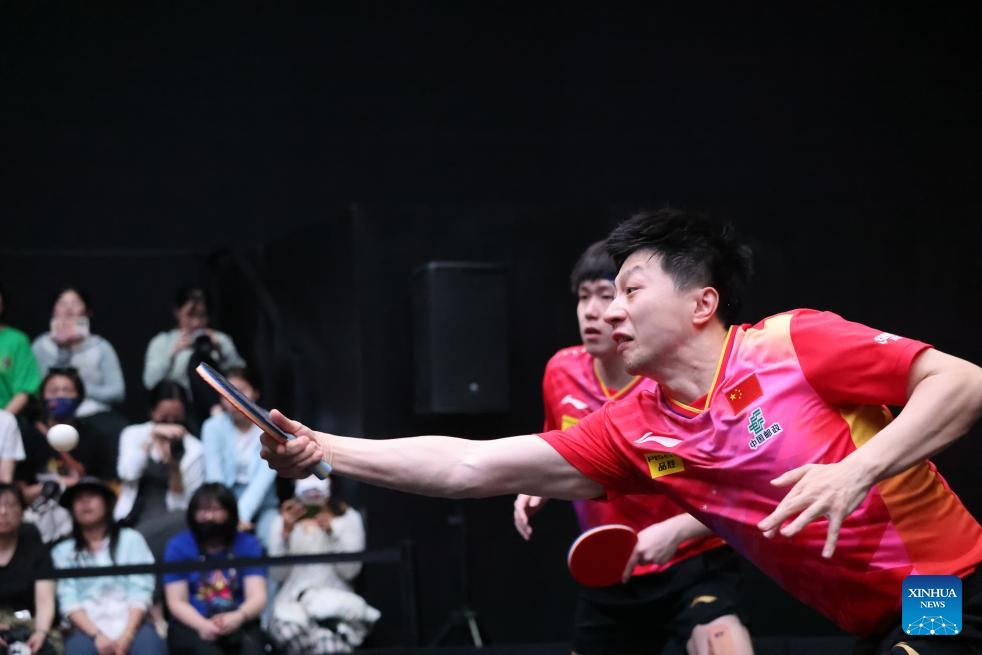 Wang Chuqin (L)/Sun Yingsha of China compete during the mixed doubles semifinal match against Harimoto Tomokazu/Hayata Hina of Japan at WTT Saudi Smash 2024 in Jeddah, Saudi Arabia, May 8, 2024. (WTT/Handout via Xinhua)