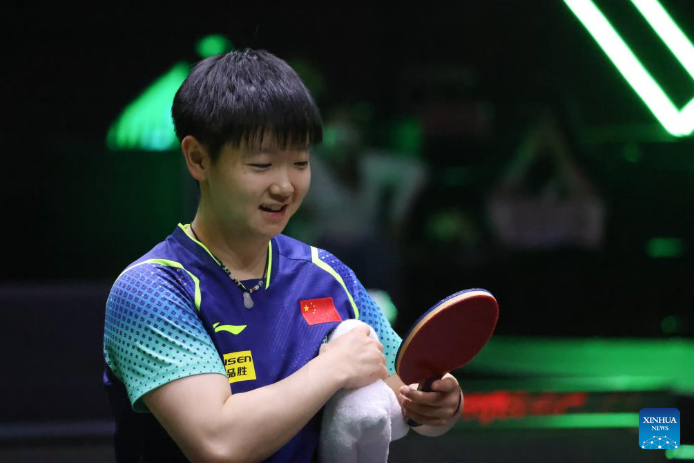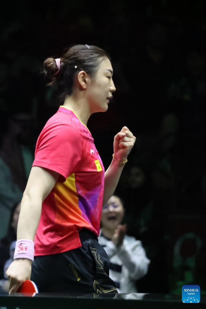 Sun Yingsha of China reacts during the women's singles round of 16 match against Jeon Jihee of South Korea at WTT Saudi Smash 2024 in Jeddah, Saudi Arabia, May 8, 2024. (Xinhua/Wang Haizhou)