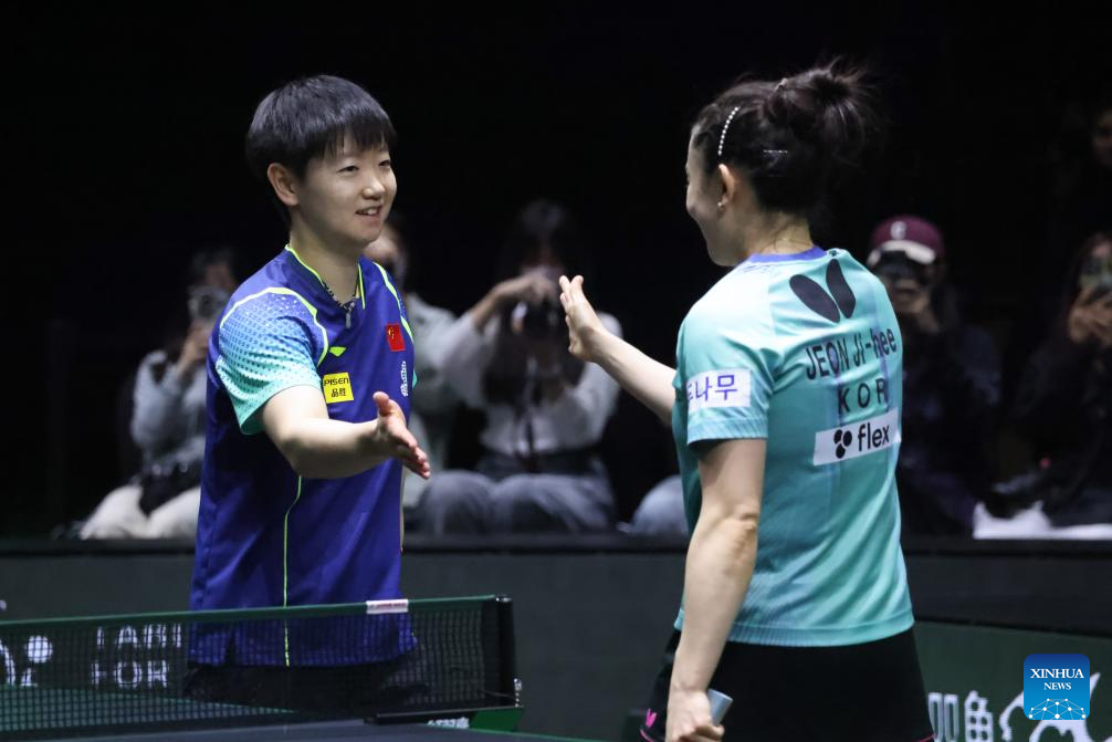 Sun Yingsha (L) of China greets Jeon Jihee of South Korea after their women's singles round of 16 match at WTT Saudi Smash 2024 in Jeddah, Saudi Arabia, May 8, 2024. (Xinhua/Wang Haizhou)