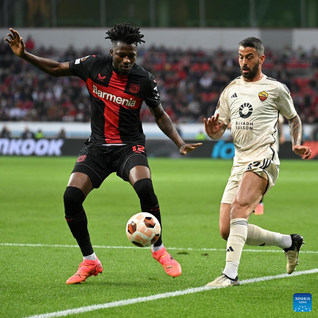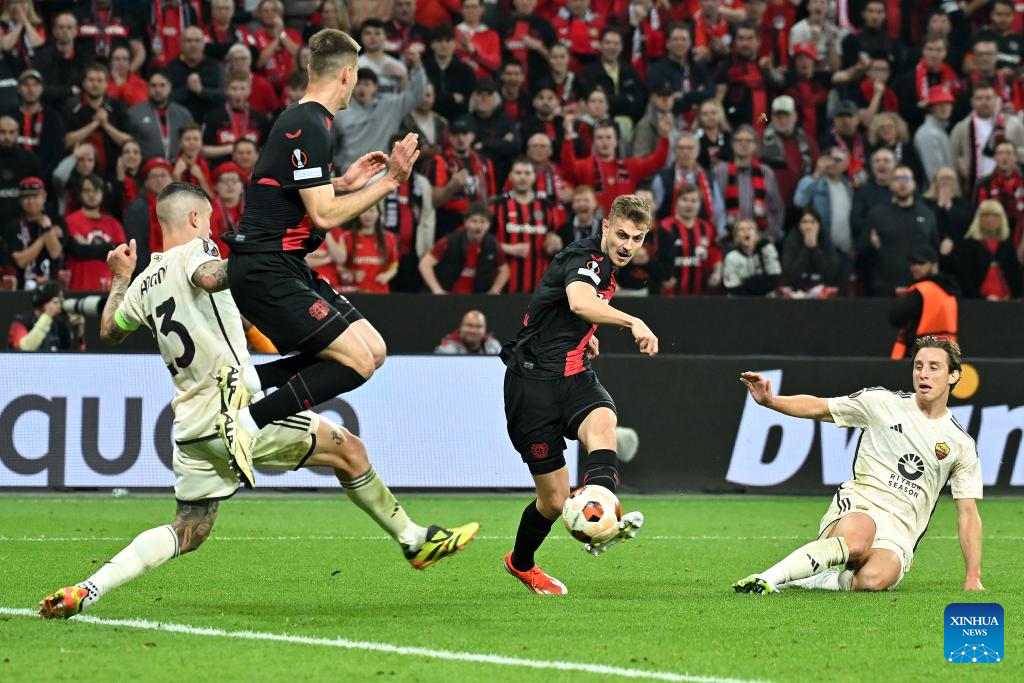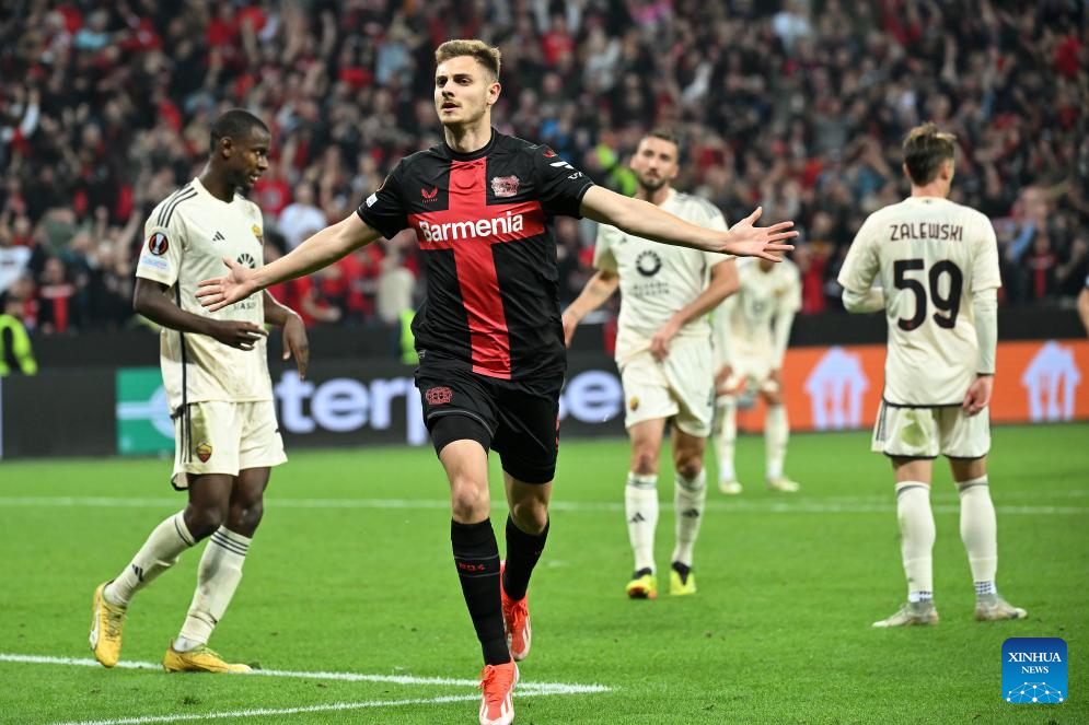 BERLIN, May 9 (Xinhua) -- Bayer Leverkusen survived a scare against Roma and set a new unbeaten European record of 49 games after snatching a late 2-2 draw to advance 4-2 on aggregate in the UEFA Europa League semifinal second leg on Thursday.
