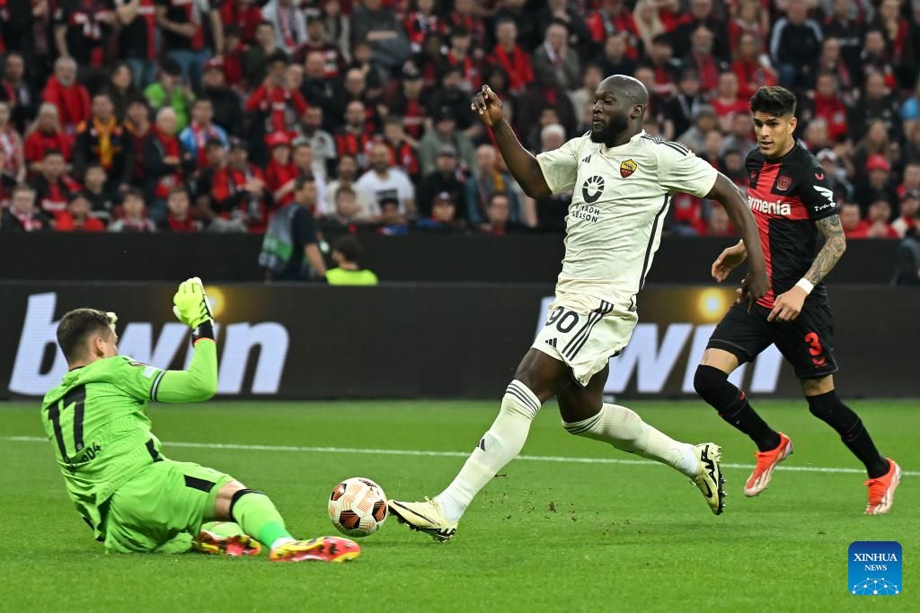 Romelu Lukaku (C) of Roma shoots the ball during the UEFA Europa League semifinal 2nd leg match between Bayer 04 Leverkusen and Roma in Leverkusen, Germany, May 9, 2024. (Photo by Ulrich Hufnagel/Xinhua)