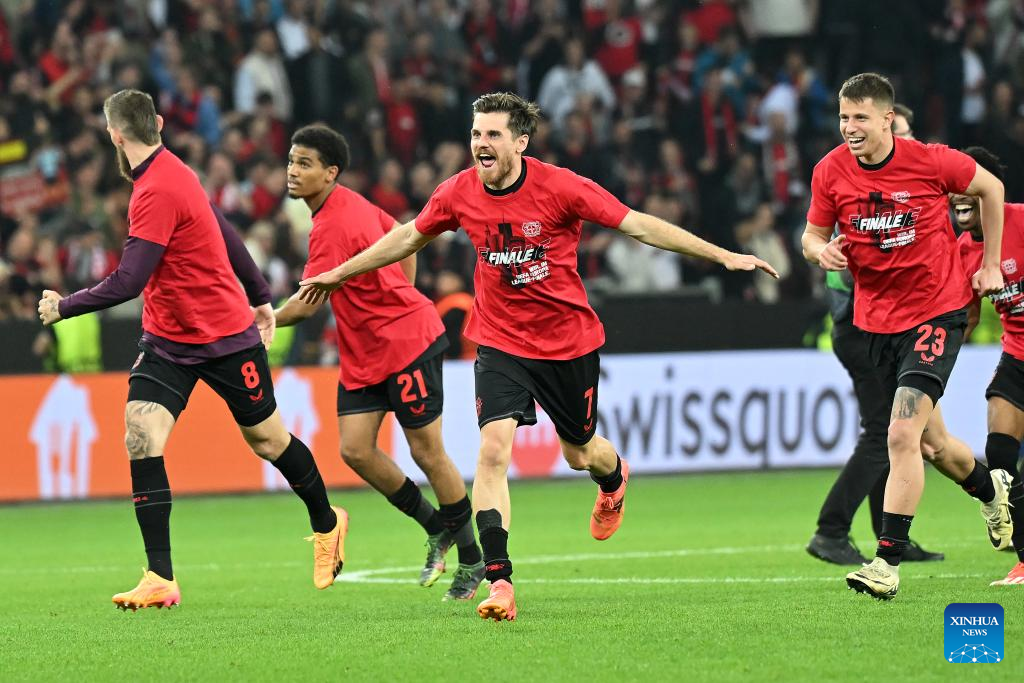 Players of Leverkusen celebrate after the UEFA Europa League semifinal 2nd leg match between Bayer 04 Leverkusen and Roma in Leverkusen, Germany, May 9, 2024. (Photo by Ulrich Hufnagel/Xinhua)