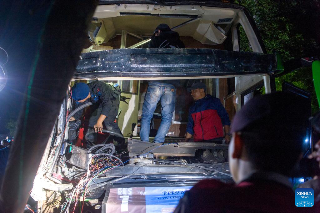 This photo taken on May 11, 2024 shows people working around a damaged bus after an accident at Palasari Village in Subang regency, West Java, Indonesia. Ten people were killed and more than 10 others wounded in a bus accident in Subang regency of Indonesia's West Java province on Saturday, a rescuer said. (Photo by Septianjar Muharam/Xinhua)