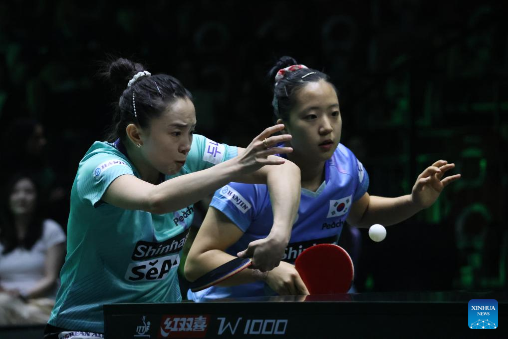Jeon Jihee (L)/Shin Yubin of South Korea compete against Wang Manyu/Chen Meng of China during the women's doubles final at WTT Saudi Smash 2024 in Jeddah, Saudi Arabia, May 10, 2024. (Xinhua/Wang Haizhou)
