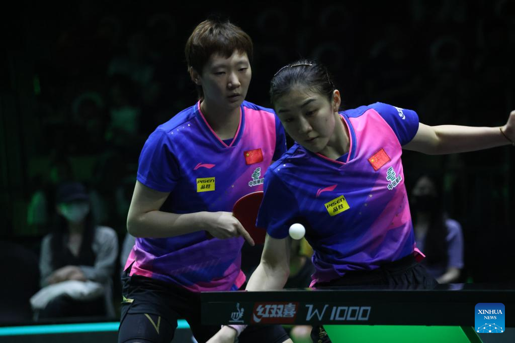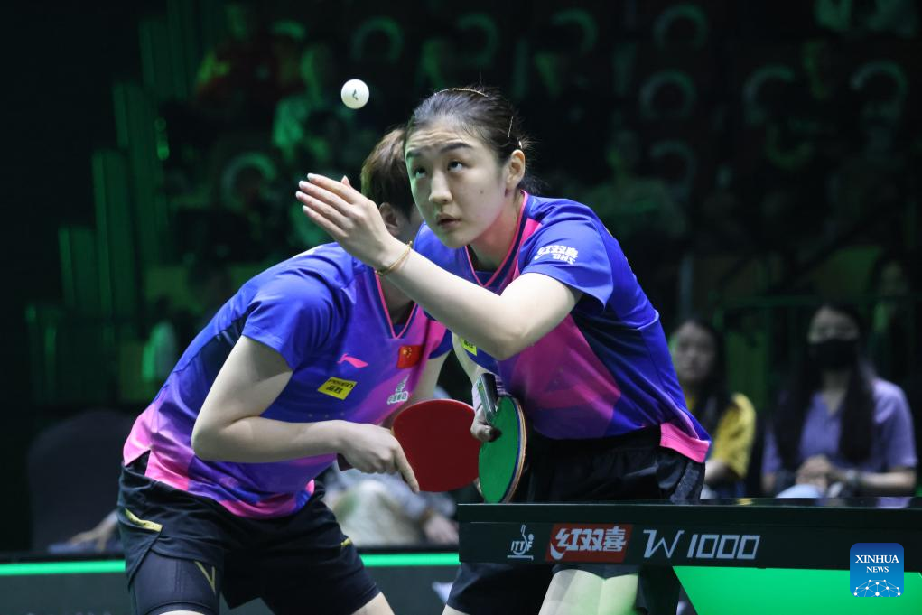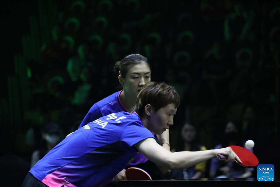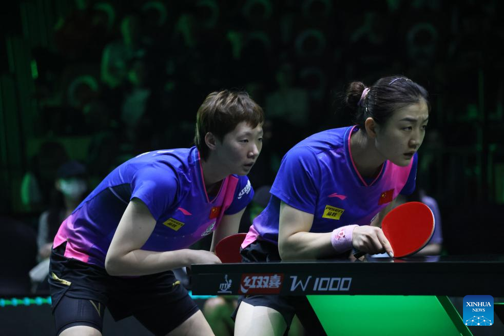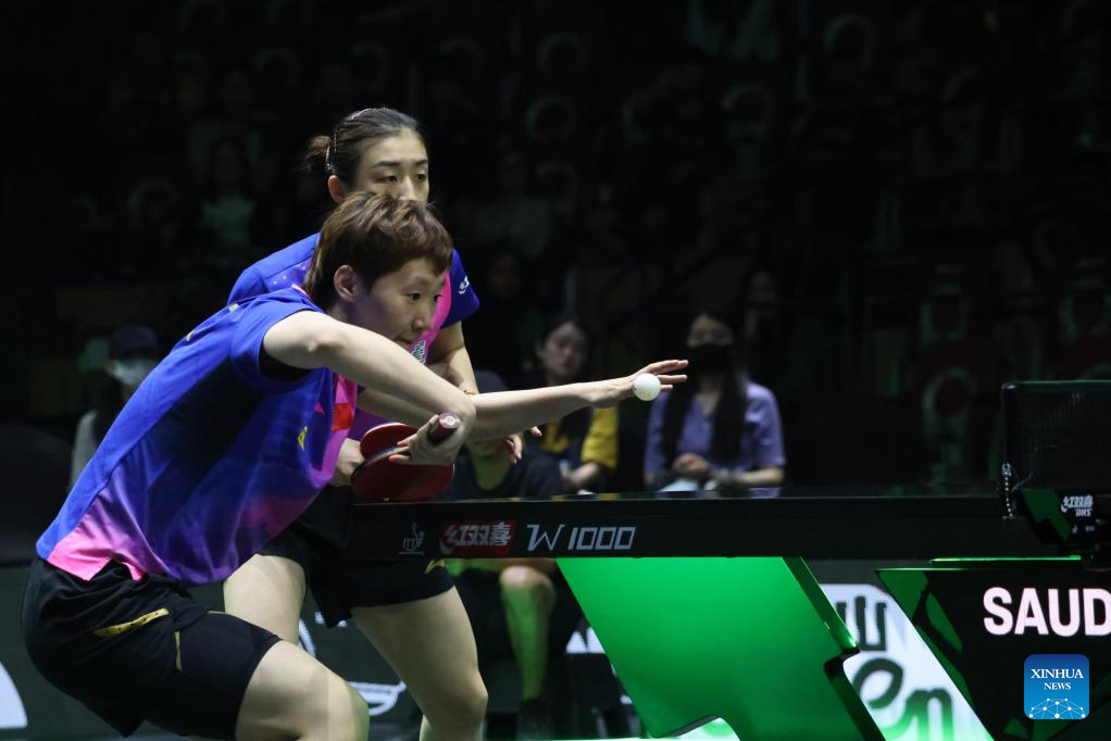 Wang Manyu/Chen Meng (front) of China compete against Jeon Jihee/Shin Yubin of South Korea during the women's doubles final at WTT Saudi Smash 2024 in Jeddah, Saudi Arabia, May 10, 2024. (Xinhua/Wang Haizhou)