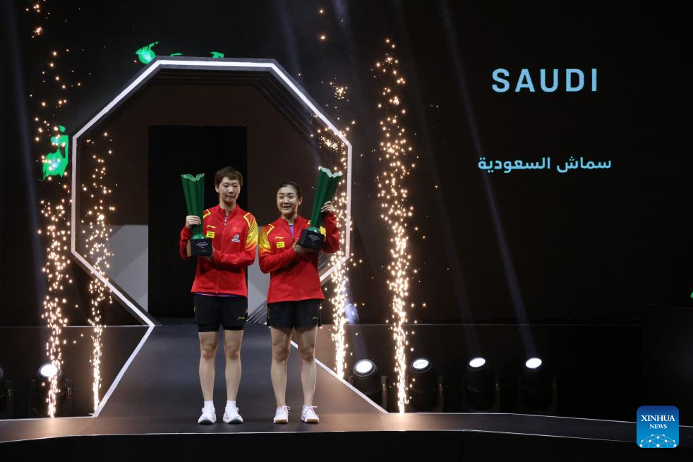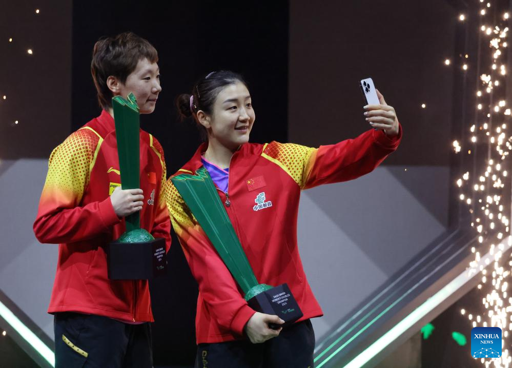 Wang Manyu (L)/Chen Meng of China react during the awarding ceremony after the women's doubles final at WTT Saudi Smash 2024 in Jeddah, Saudi Arabia, May 10, 2024. (Xinhua/Wang Haizhou)