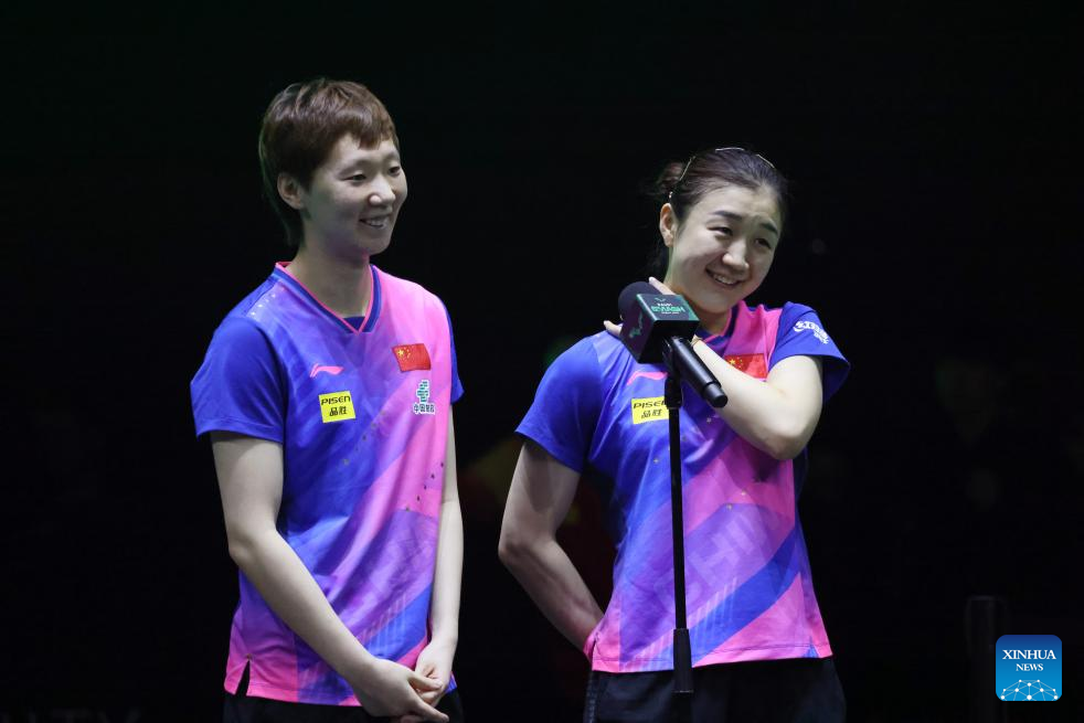 Wang Manyu (L)/Chen Meng of China react during an interview after the women's doubles final at WTT Saudi Smash 2024 in Jeddah, Saudi Arabia, May 10, 2024. (Xinhua/Wang Haizhou)