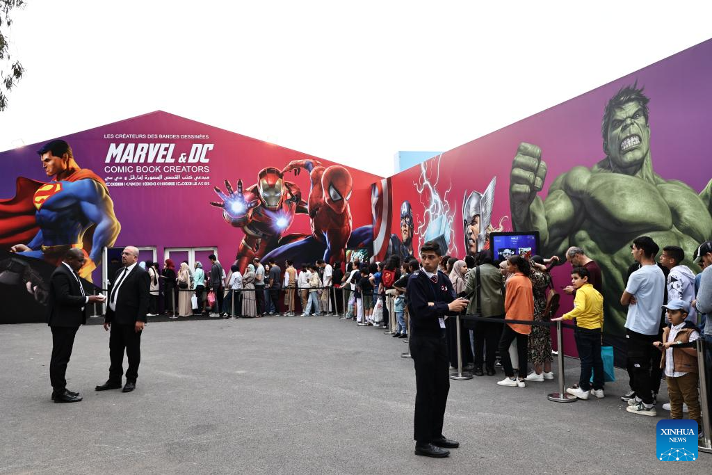 People stand in queue for a Marvel & DC exhibition during the 29th edition of the International Book and Publishing Fair at Rabat, Morocco, May 11, 2024. (Xinhua/Huo Jing)