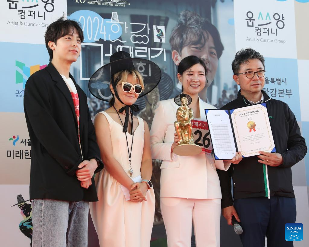 Competition winner Kwon Soa (3rd L) poses for photo after a space-out competition at Banpo Han River in Seoul, south Korea, May 12, 2024. A total of 80 teams participated in a space-out competition held at Banpo Han River Park in Seoul on Sunday. The winner was selected based on the participants' heart rate and the vote of the audience. (Xinhua/Yao Qilin)