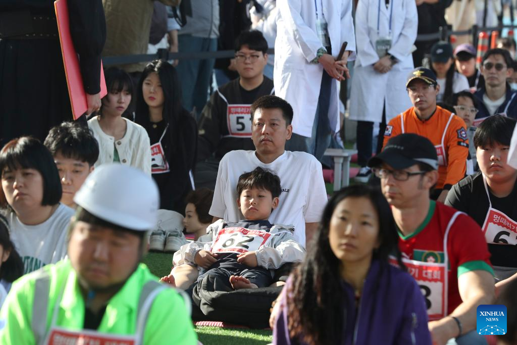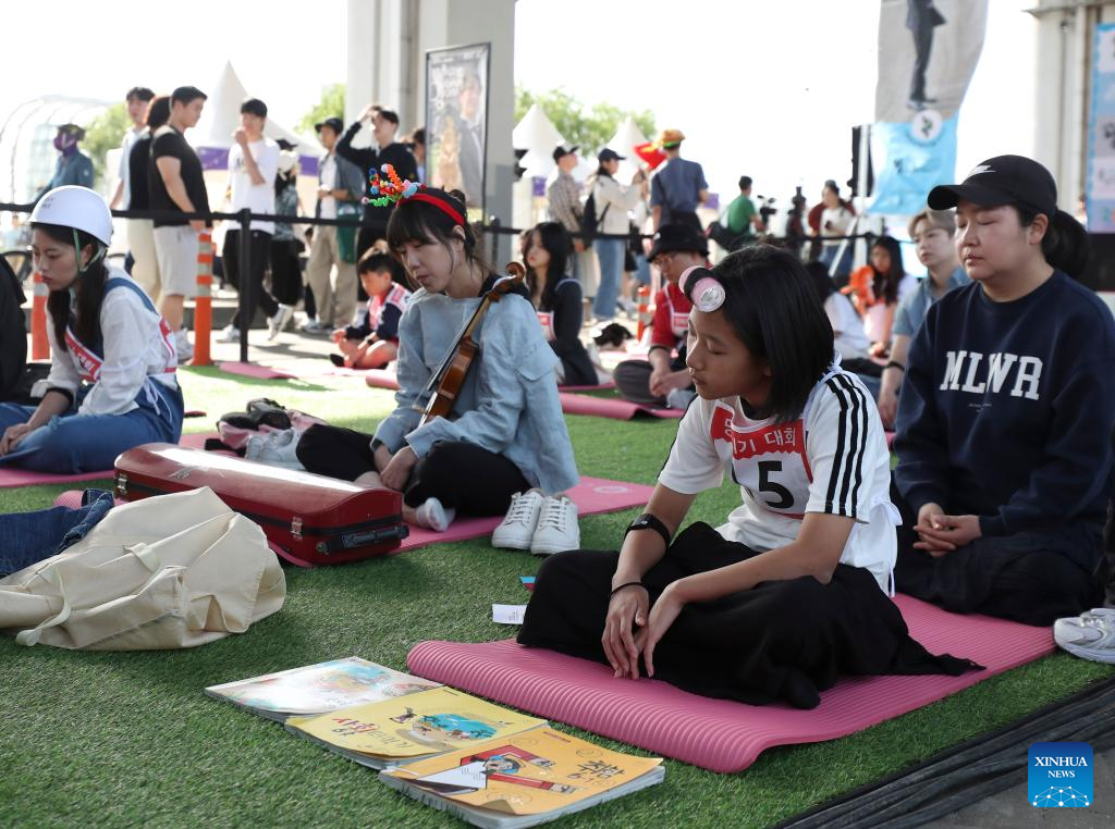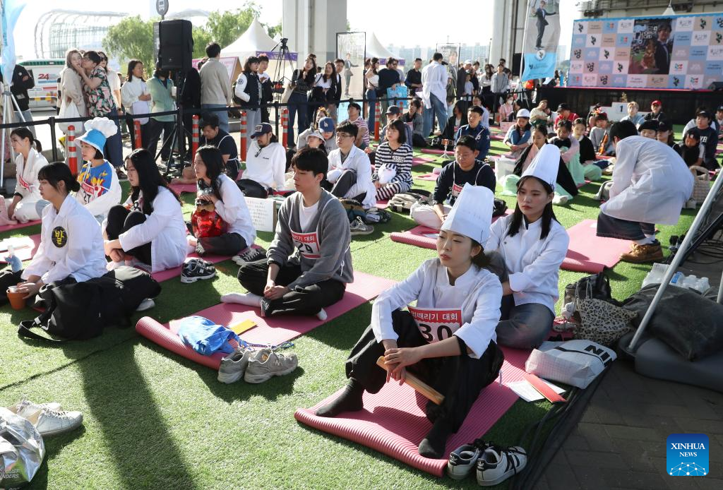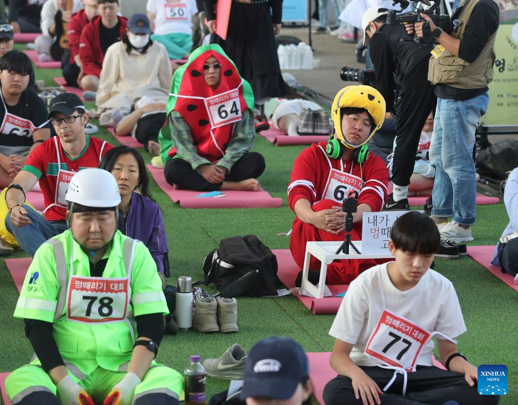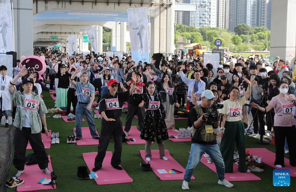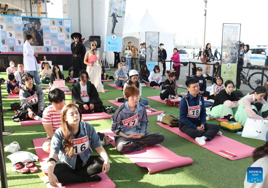Competitors participate in a space-out competition at Banpo Han River Park in Seoul, South Korea, May 12, 2024. A total of 80 teams participated in a space-out competition held at Banpo Han River Park in Seoul on Sunday. The winner was selected based on the participants' heart rate and the vote of the audience. (Xinhua/Yao Qilin)