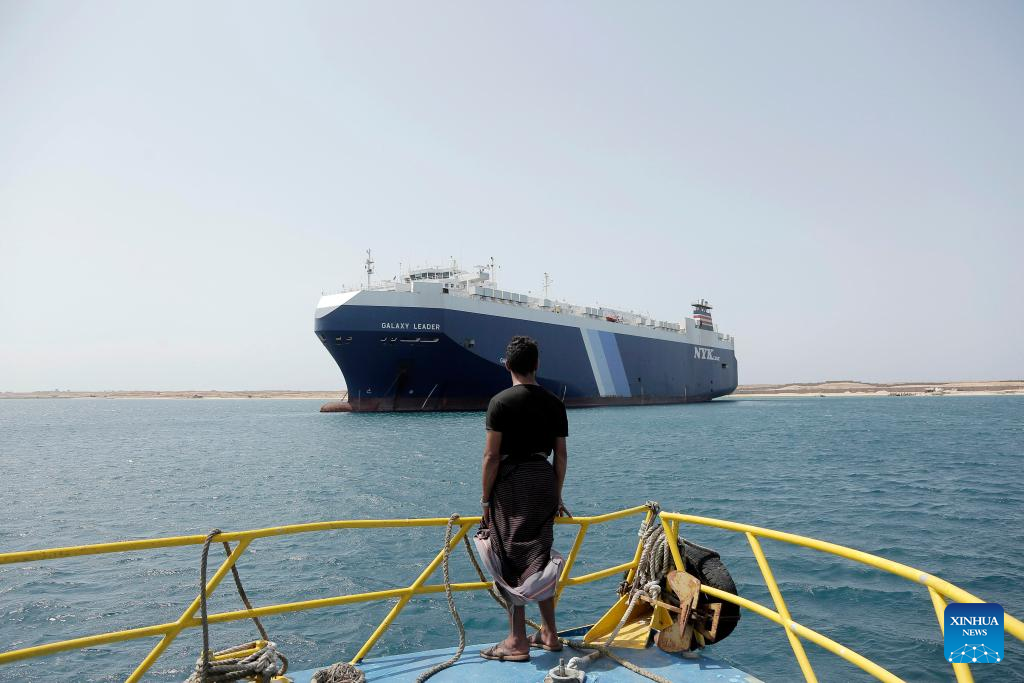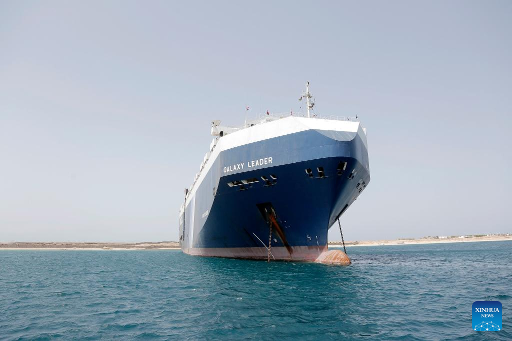 The Galaxy Leader is seen near the port city of Hodeidah in western Yemen, May 12, 2024. A delegation from the International Committee of the Red Cross (ICRC) visited on Sunday the Galaxy Leader, a vehicle carrier hijacked by the Houthi group, and met with its crew near the port city of Hodeidah in western Yemen. (Photo by Mohammed Mohammed/Xinhua)