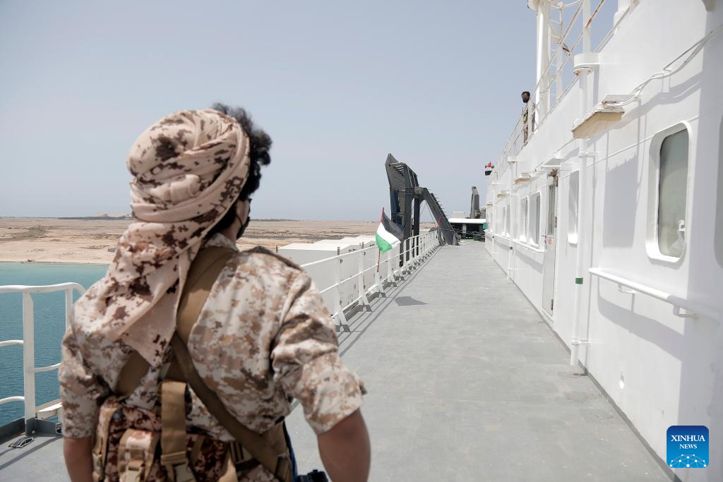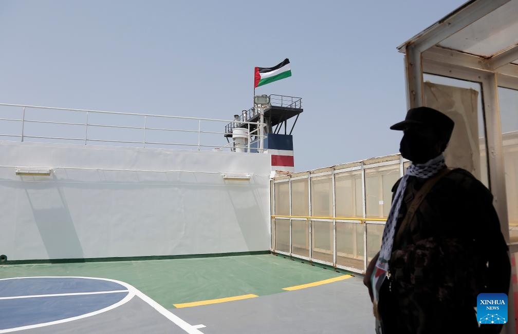A Houthi group member stands on the deck of the Galaxy Leader near the port city of Hodeidah in western Yemen, May 12, 2024. A delegation from the International Committee of the Red Cross (ICRC) visited on Sunday the Galaxy Leader, a vehicle carrier hijacked by the Houthi group, and met with its crew near the port city of Hodeidah in western Yemen. (Photo by Mohammed Mohammed/Xinhua)