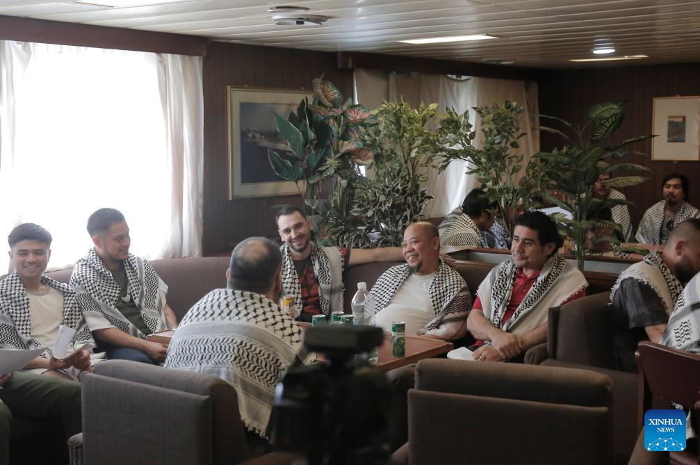Crew members of the Galaxy Leader participate in a meeting with a delegation from the International Committee of the Red Cross (ICRC) on the ship near the port city of Hodeidah in western Yemen, May 12, 2024. A delegation from the International Committee of the Red Cross (ICRC) visited on Sunday the Galaxy Leader, a vehicle carrier hijacked by the Houthi group, and met with its crew near the port city of Hodeidah in western Yemen. (Photo by Mohammed Mohammed/Xinhua)