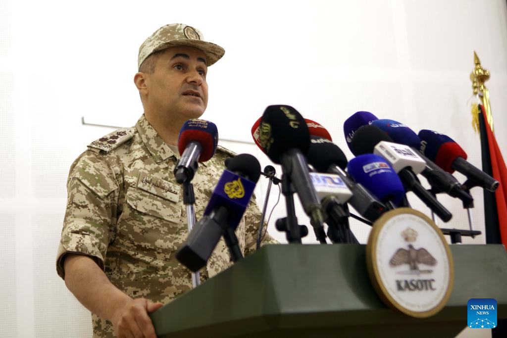 Mostafa Al-Hiyari, director of Military Media at the Jordan Armed Forces-Arab Army, speaks at a press conference in Amman, Jordan, May 12, 2024. The annual Eager Lion military drill hosted by the Jordan Armed Forces started Sunday, with ground, naval, and air forces from 33 countries, including the United States and 10 other Arab countries, partaking in it. (Photo by Mohammad Abu Ghosh/Xinhua)