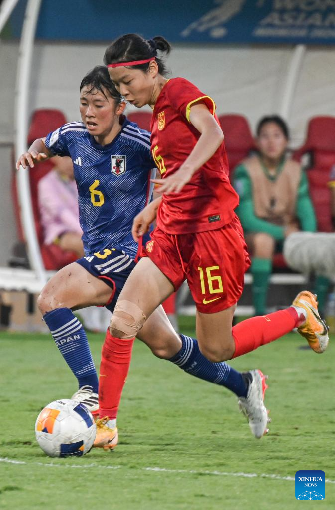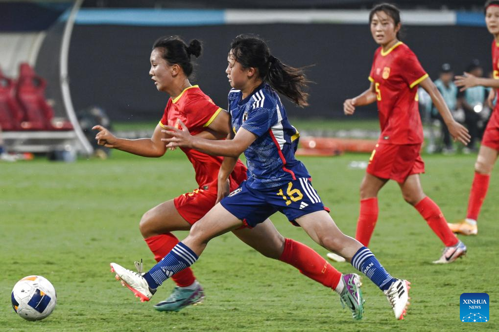Dong Yujie (L) of China vies with Fukushima Noa of Japan during the Group B match of the AFC U17 Women's Asian Cup 2024 between Japan and China in Bali, Indonesia, May 13, 2024. (Xinhua/Agung Kuncahya B.)
