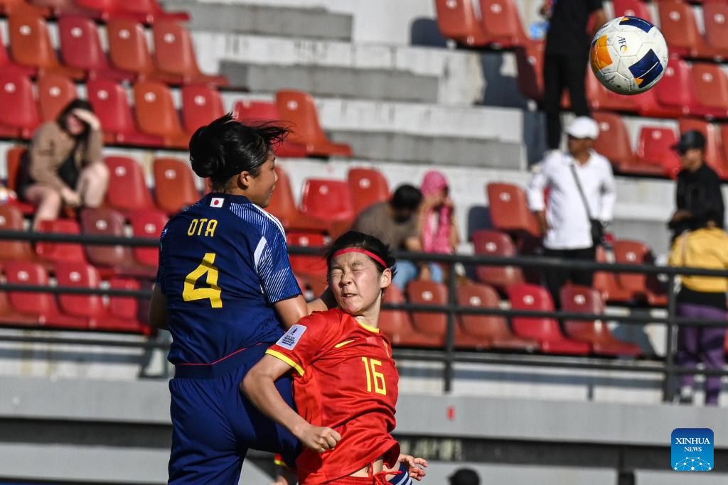 Zhang Jie (L) of China vies with Aso Tamami of Japan during the Group B match of the AFC U17 Women's Asian Cup 2024 between Japan and China in Bali, Indonesia, May 13, 2024. (Xinhua/Agung Kuncahya B.)