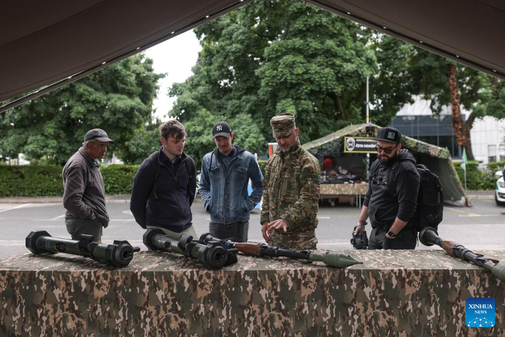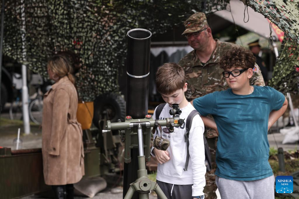 A soldier introduces light anti-armor weapons during the open day of the Slovenian Army in Maribor, Slovenia, on May 14, 2024. The Slovenian Army opened its doors to the public here on Tuesday to mark the Slovenian Army Day which falls on May 15. (Photo by Zeljko Stevanic/Xinhua)